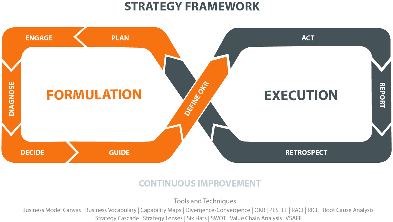 Link Formulation and Execution to Continuously Improve Your Outcomes Know More KNOW MORE ©️ 2021, InnowayIT Inc. Strategy Formulation Plan Engage Sponsor Capture vision and concerns Define Scope Define time horizon Identify list of stakeholders Engage Invite Stakeholders Brief on the Purpose Capture stakeholder concerns Assign responsibilities (RACI) Play back Diagnose Study concerns and disruptions Apply Strategic Lenses Discover Strategic Choices Define Options Play back Decide Review Choices and Options Analyze Pros and Cons Conduct Review sessions Stakeholders Decisions Play back Guide Define guiding policies Conduct Review Sessions Define Themes and Objectives Define Initiatives Initiate Technology Architecture Planning Define OKR Decide OKR cadence Define Key Results Link Monitoring KPIs Assign to Stakeholders Play back Engage Invite Stakeholders Brief on the Purpose Capture stakeholder concerns Assign responsibilities (RACI) Play back Guide Define guiding policies Conduct Review Sessions Define Themes and Objectives Define Initiatives Initiate Technology Architecture Planning Diagnose Study concerns and disruptions Apply Strategic Lenses Discover Strategic Choices Define Options Play back Define OKR Decide OKR cadence Define Key Results Link Monitoring KPIs Assign to Stakeholders Play back Strategy Execution Act Launch Initiatives Define Charters Manage Requirements Develop Solution Manage Backlog l Report Generate Report Explain variances Share Report Receive Feedback Update backlog Retrospect Gather Data Generate Insights Identify issues Decisions Play Back l Report Generate Report Explain variances Share Report Receive Feedback Update backlog Retrospect Gather Data Generate Insights Identify issues Decisions Play Back